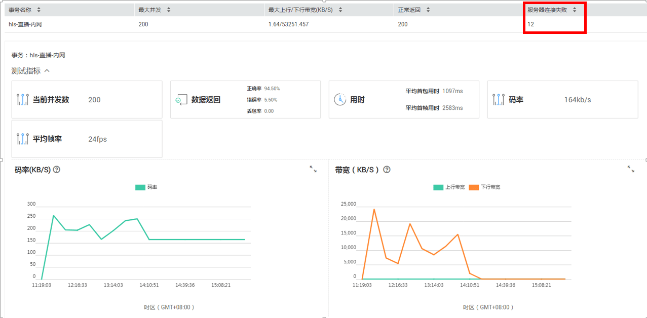 下图为对应的实时报告,首先查看是否存在错误信息,可以看到当200个用户对服务器进行并发访问时,存在12次的连接错误,说明服务端在当前压力下无法正常处理HLS直播链接,会导致这部分用户无法打开视频。