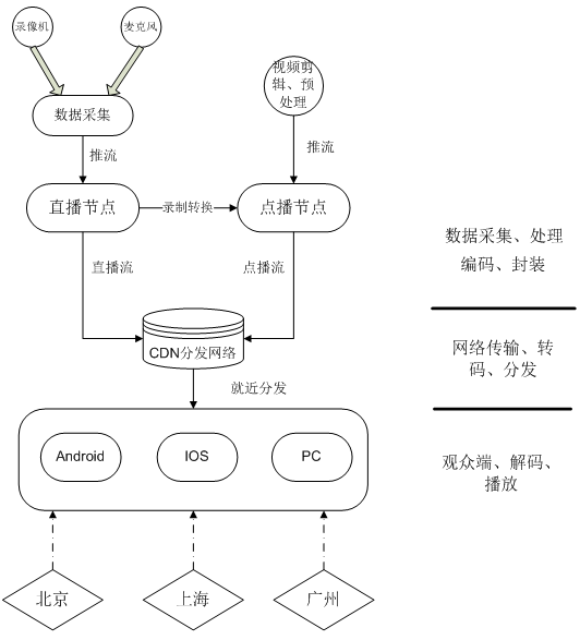 下面我们来了解下流媒体播放的主要流程,流媒体播放主要分为直播和点播2大类,区别在于直播是利用一些新兴或者传统的媒介实时的进行图像和声音的采集,如录像机,麦克风、手机等,将采集的数据进行处理和编码,利用上面提到了流媒体协议进行封装,之后将数据流推送到直播节点上,观众可以实时进行观看。点播的数据来源则是已存在的视频,或者是通过直播流录制转换后的视频,可以回放观看。之后流媒体服务器通过CDN分发网络,根据拉流端的码率实时转码,就近的将数据流发送至客户端,缩短请求响应时间。
