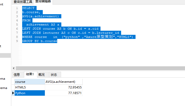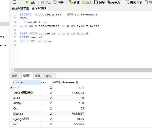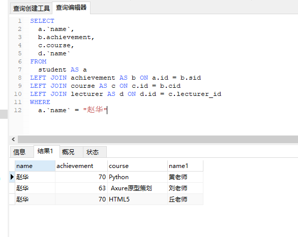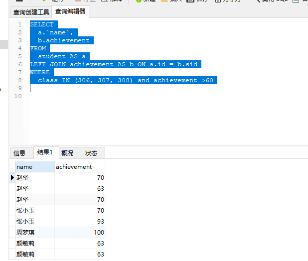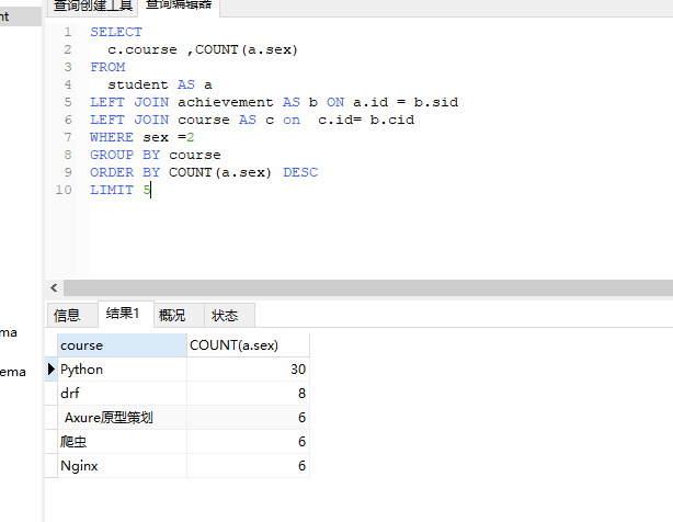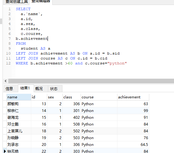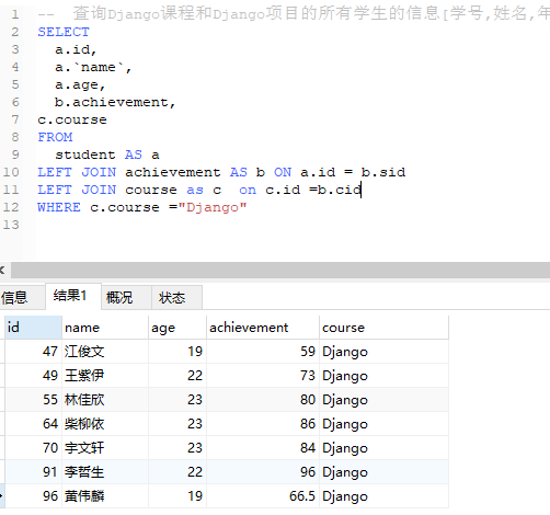 1. 查询Django课程和Django项目的所有学生的信息[学号,姓名,年龄,成绩]
