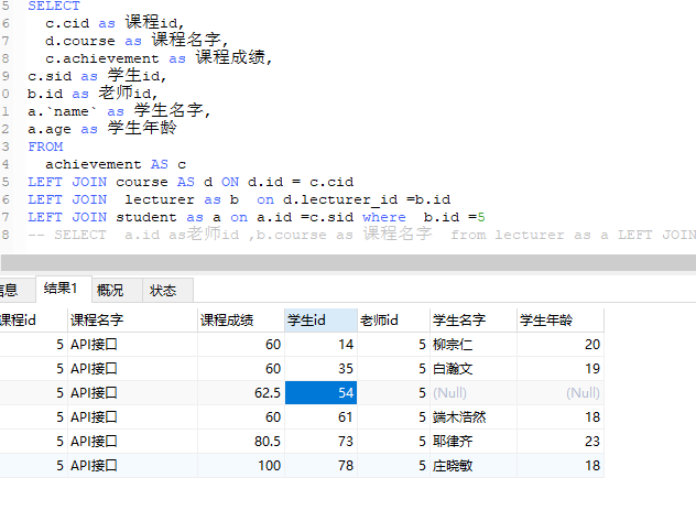 2. 查询id=5的老师的所有学生信息[学号、姓名、年龄]