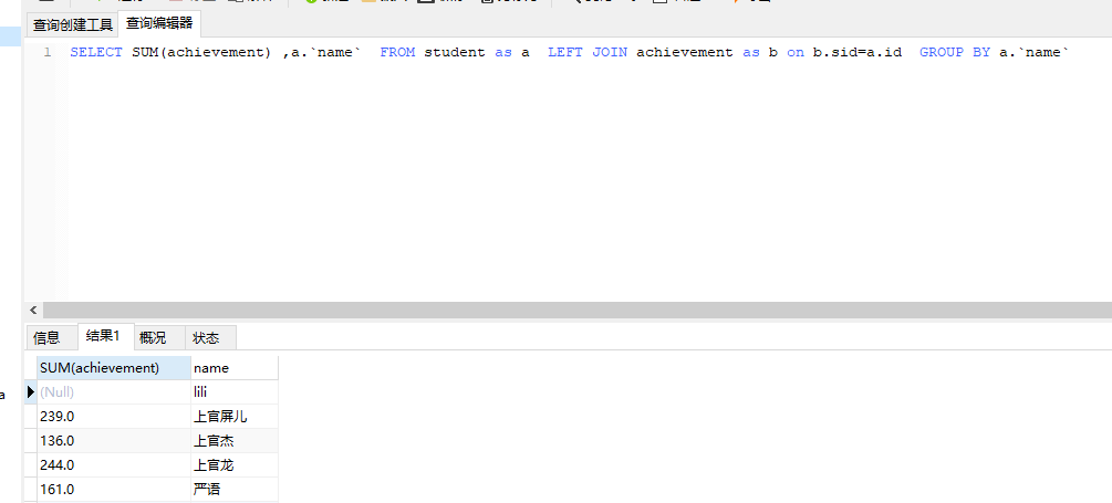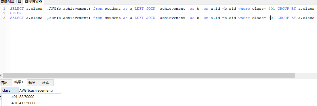 9.查出 401 班所有学生的 平均分和总分[分组查询]。