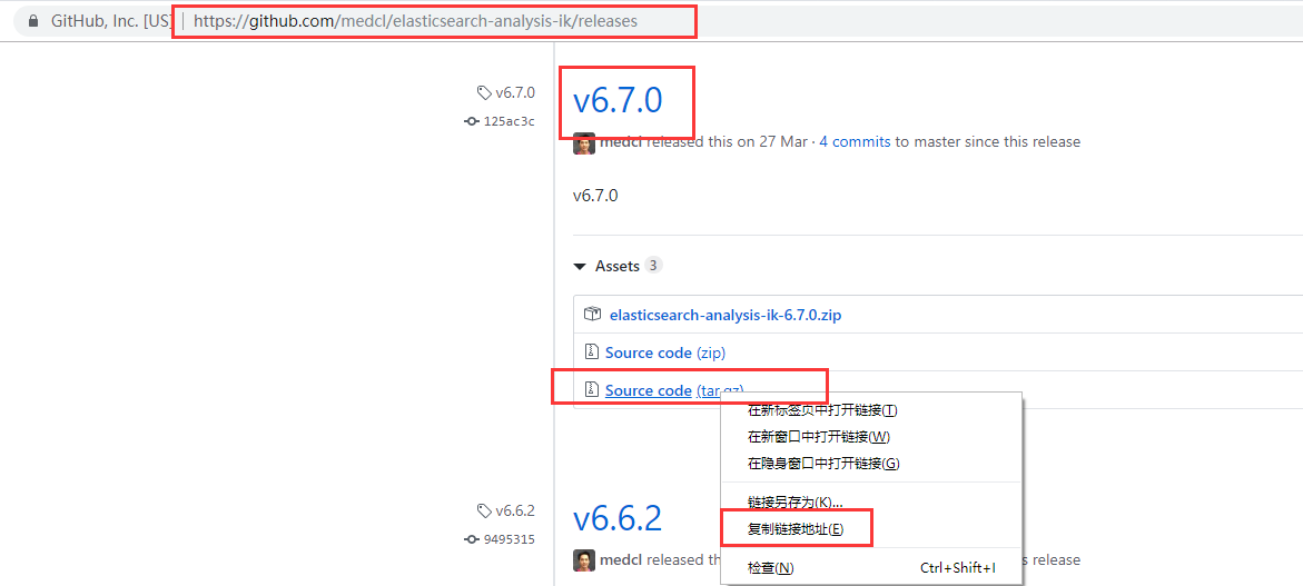 在Github上找到与elasticsearch对应的版本(版本必须一致),选择tar包右键获取链接: