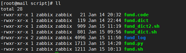 -rwxr-xr-x 1 zabbix zabbix 801 Jan 15 09:56 fund_dict.sh 基金净值筛选shell