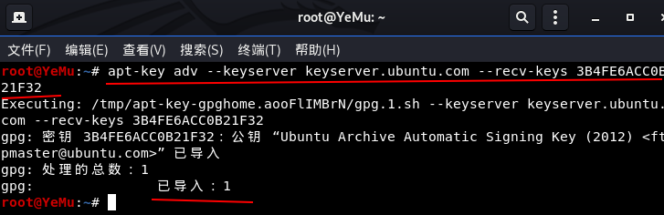 命令:apt-key adv --keyserver keyserver.ubuntu.com --recv-keys 3B4FE6ACC0B21F32