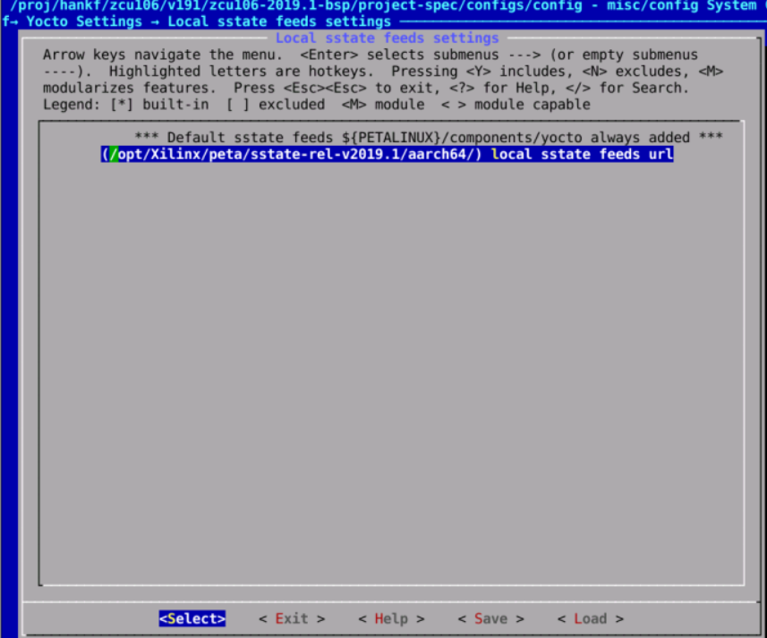 CONFIG_YOCTO_LOCAL_SSTATE_FEEDS_URL="/opt/Xilinx/peta/sstate-rel-v2019.1/aarch64/"