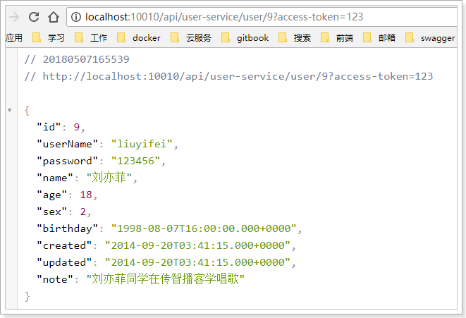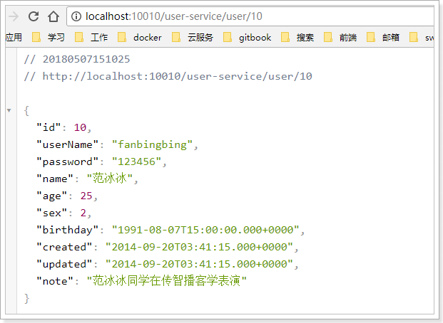 访问的路径中需要加上配置规则的映射路径,我们访问:http://127.0.0.1:8081/user-service/user/10
