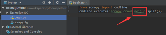 在第二个meijutt100和scrapy.cfg同级目录下,新建一个文件,如begin.py(名字随便)用于模拟命令行启动scrapy项目