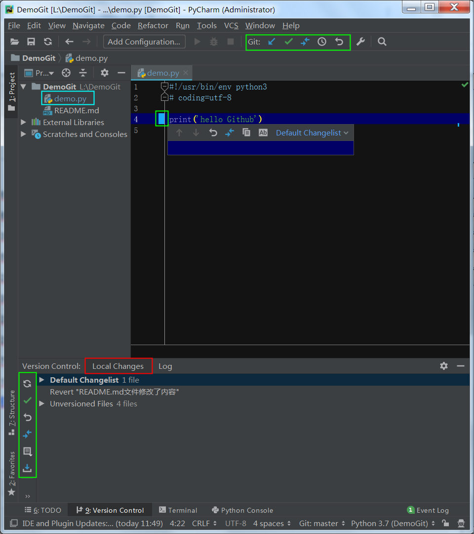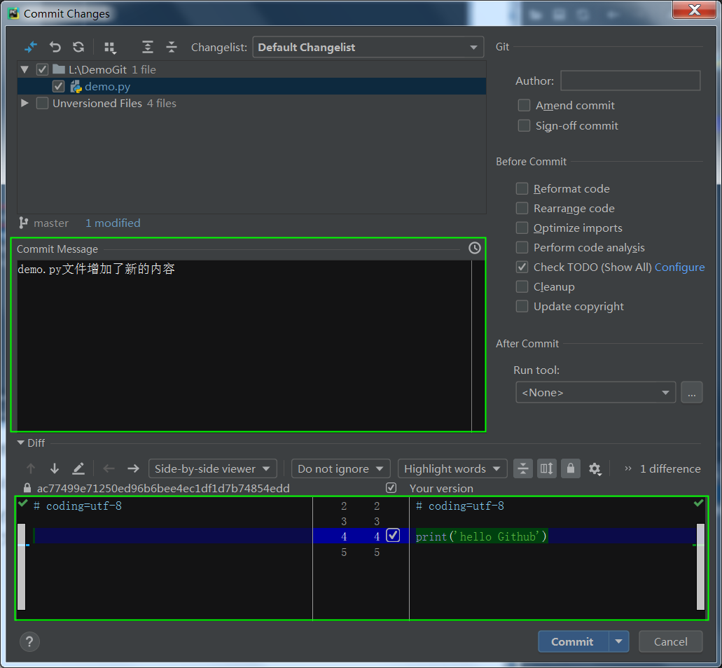 注意上面窗口中用绿色框标记的地方,在这个演示中,向demo.py件中添加了一行新的信息
