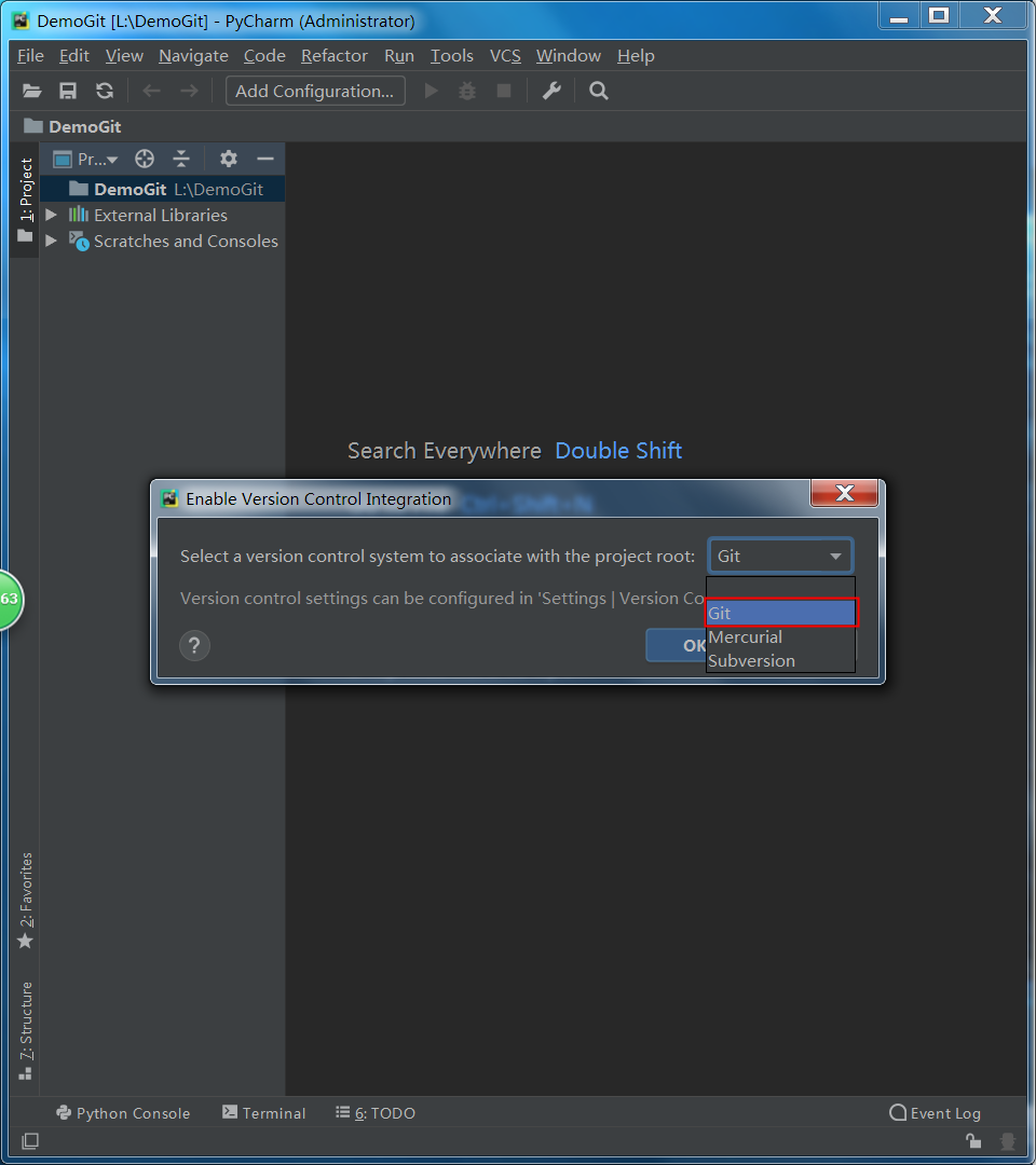 点击▼ 在下拉菜单中选中Git,点击OK确认 ,完成对DemoGit文件夹的初始化。