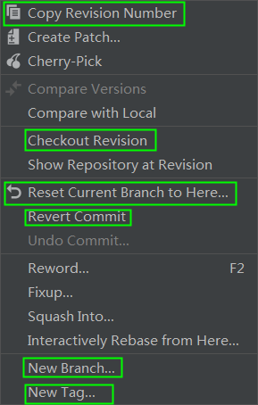 在上述界面中关于版本控制的功能选项用绿色框标记出: