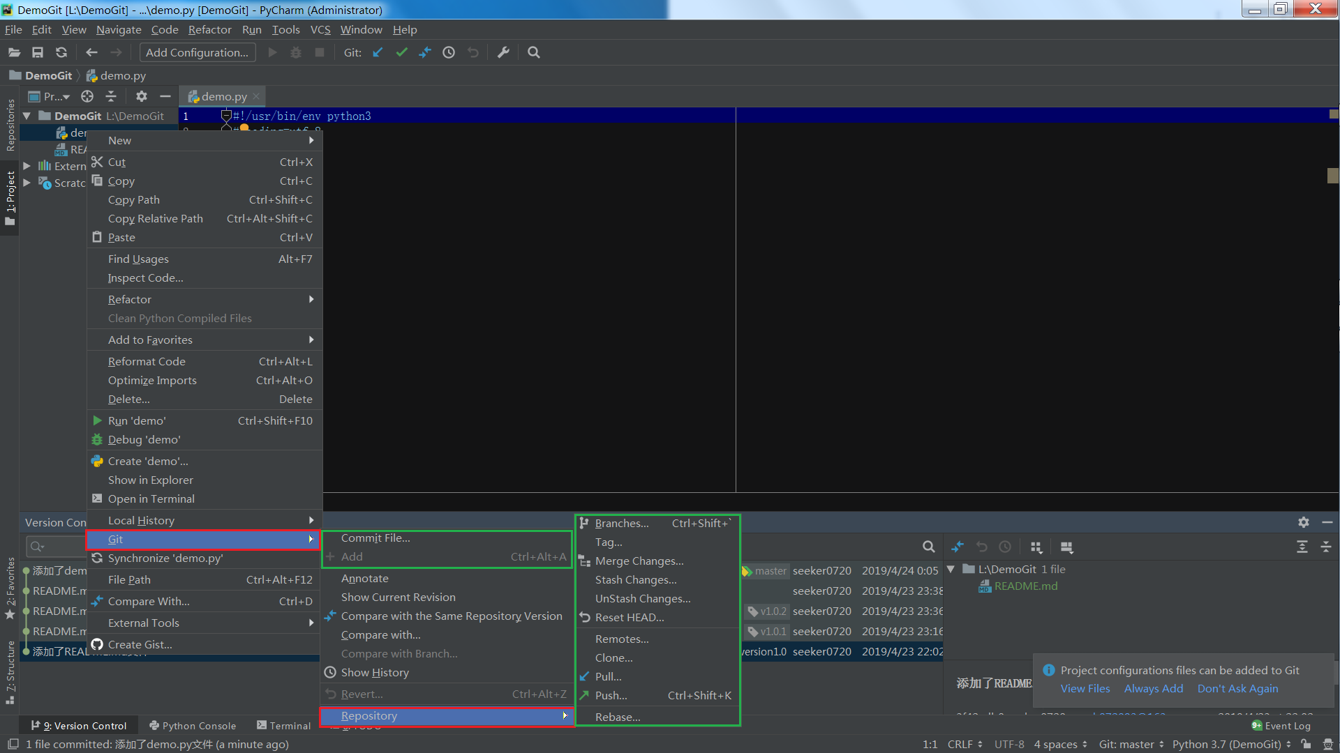 PyCharm本身自带了git,稍微配置一下就可以很好的在图形界面下进行Python项目的版本控制