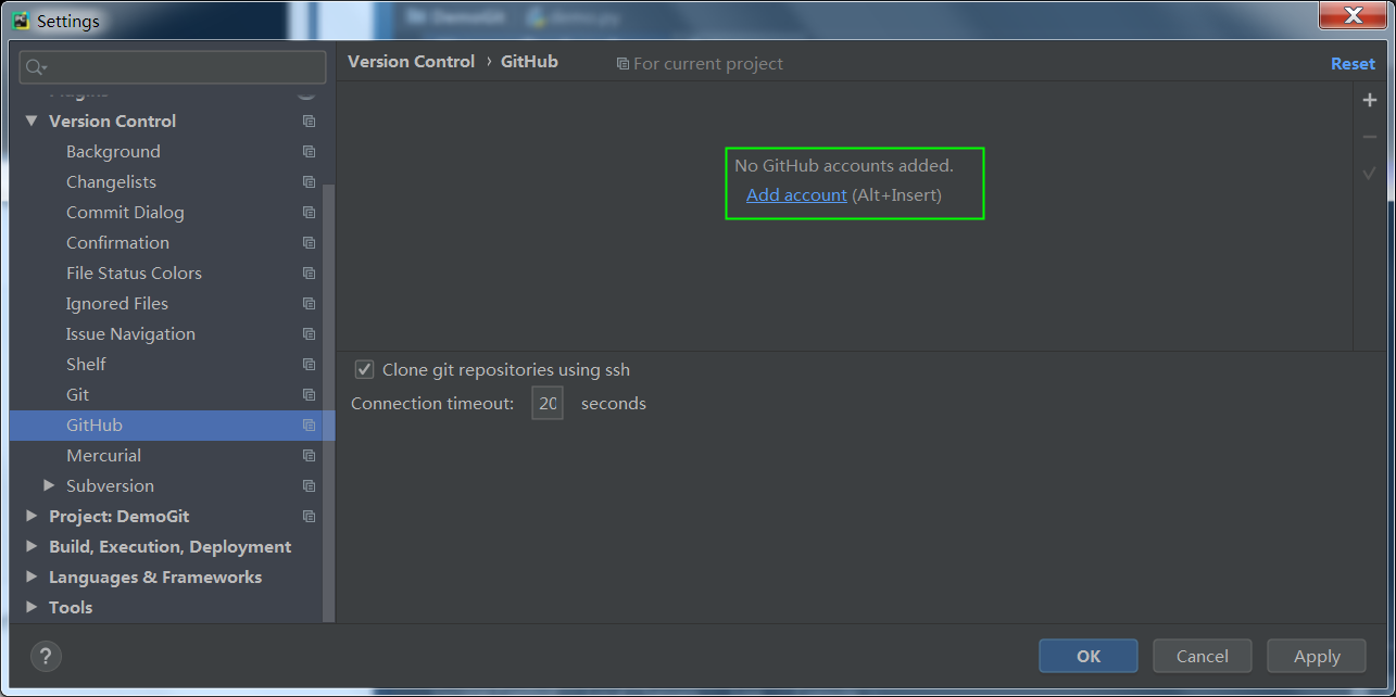 打开PyCharm,依次选择 File => Settings 在弹出窗口中选择 GitHub,出现下面的窗口: