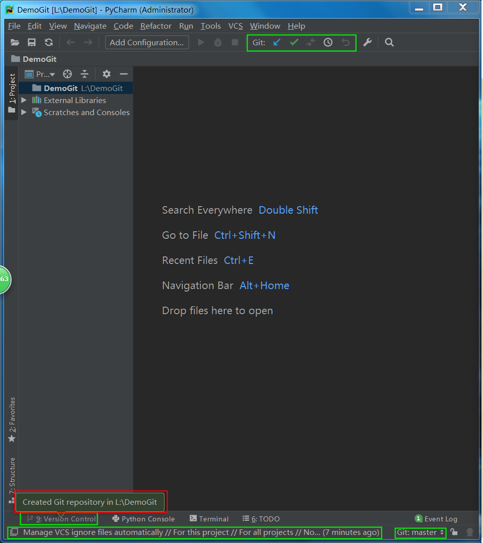 为了方便演示,打开PyCharm,创建一个名为DemoGit的项目,创建完成后依次选择