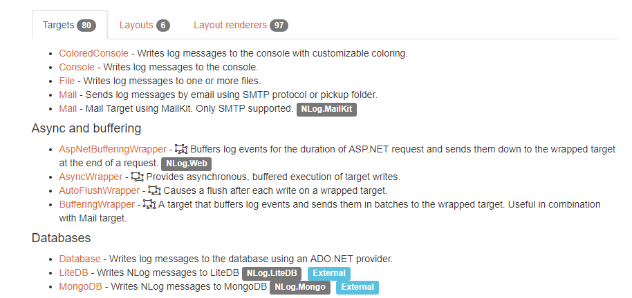 <target> 日志输出目标。目前NLog支持八十余种输出,如控制台,邮件,窗体,数据库等。具体支持的目标,可参考 这里 。一个<targets>中可以配置多个<target>输出。