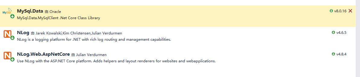 Install-Package NLog -Version 4.6.5 Install-Package NLog.Web.AspNetCore -Version 4.8.4Install-Package MySql.Data -Version 8.0.16 -