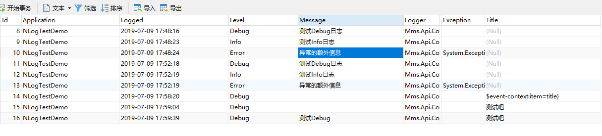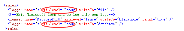 这里大家可能会问,为什么没有Debug信息输出呢,这是因为我们上面NLog配置设置的记录日志的最低级别为Info.所以比Info级别小的Debug信息不会记录。如果想记录的话就把这个级别设置成Debug或者比Debug小的Trace就可以记录了。如下图所示: