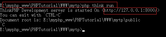 3)、完成后切换到mytp目录下,输入命令php think run测试,在浏览器输入http://127.0.0.1:8000显示界面成功