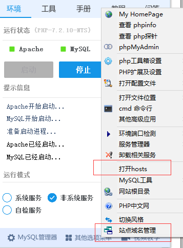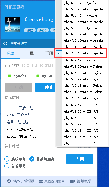 我使用的是phpstudy2018,注意安装文件夹不要有空格和中文字符,不然切换高版本php+apache启动不了会提示的