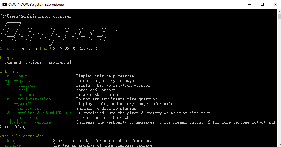 打开cmd命令窗口,输入composer命令查看是否安装成功,以下信息ok