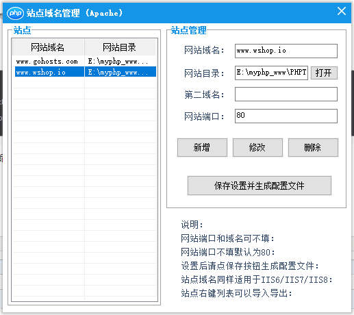 1) 、添加域名跟网站目录E:\myphp_www\PHPTutorial\WWW\mytp\public ,新增,保存生成。注意不要有空格或中文字符文件夹目录