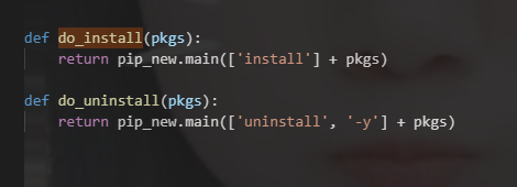 1. return pip_new.main(['install'] + pkgs) 2.return pip_new.main(['uninstall', '-y'] + pkgs)