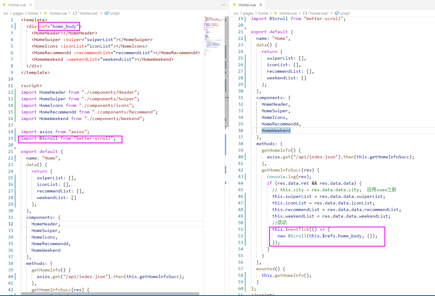 Vue.js 提供了我们一个获取 DOM 对象的接口—— vm.$refs。在这里,我们通过了 this.$refs.wrapper 访问到了这个 DOM 对象,并且我们在 mounted 这个钩子函数里,this.$nextTick 的回调函数中初始化 better-scroll 。因为这个时候,wrapper 的 DOM 已经渲染了,我们可以正确计算它以及它内层 content 的高度,以确保滚动正常。