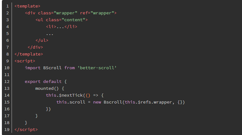 那么,我们怎么初始化 better-scroll 呢,如果是上述 html 结构,那么初始化代码如下:
