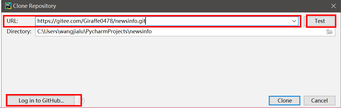 》》之后到PyCharm >VCS>Checkout from Version Control >Git 把刚刚在码云上创建的项目地址复制的链接粘贴到URL 进行text测试 请使用码云的用户名和密码 注意(用户名必须是邮箱 !!)点击clone 开始克隆项目