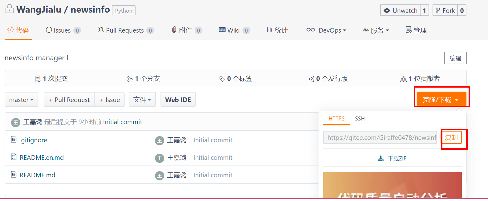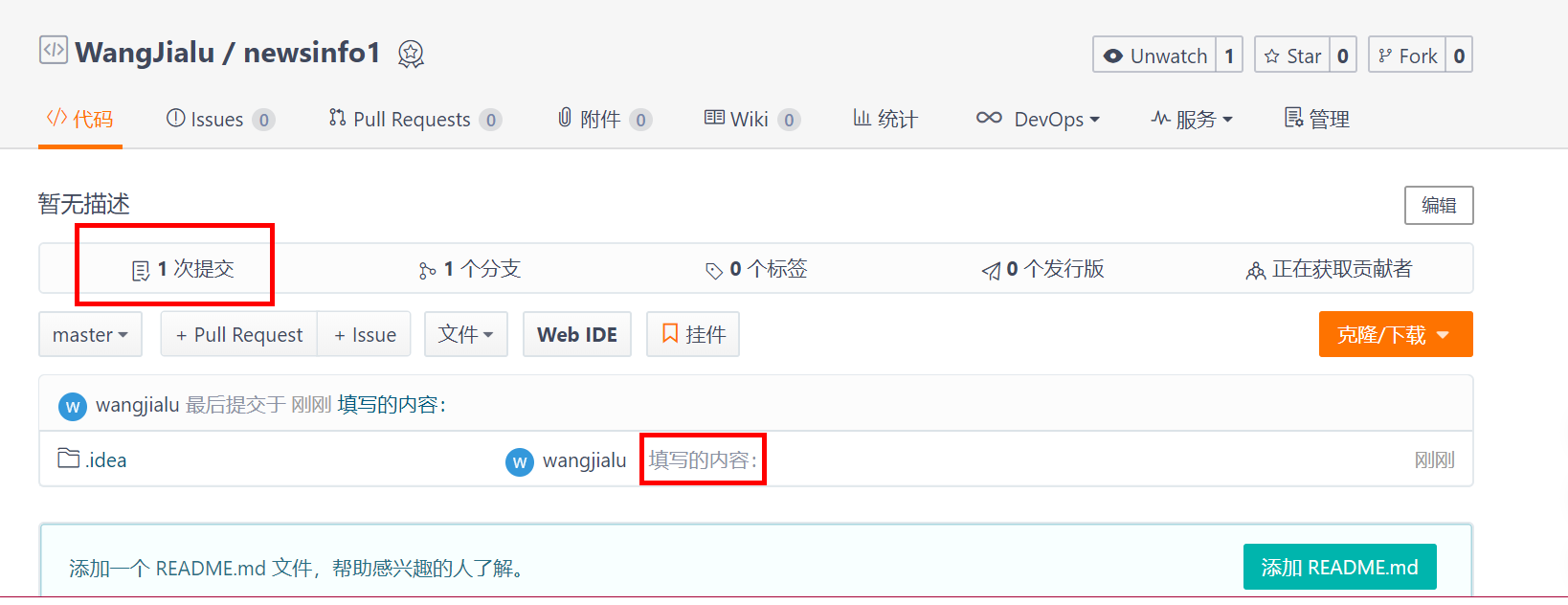 》》之后在点击网页码云的库看一下是否存在上传的内容