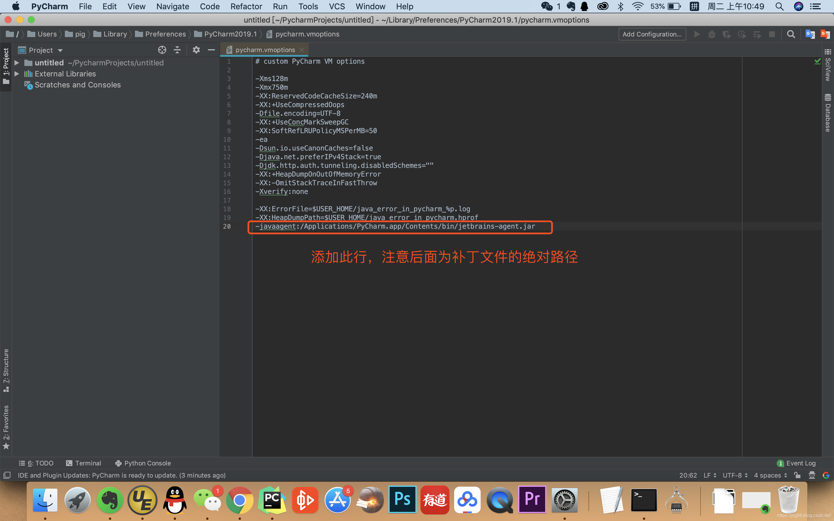 在打开的vmoptions编辑窗口末行添加:-javaagent:/Applications/PyCharm.app/Contents/bin/jetbrains-agent.jar