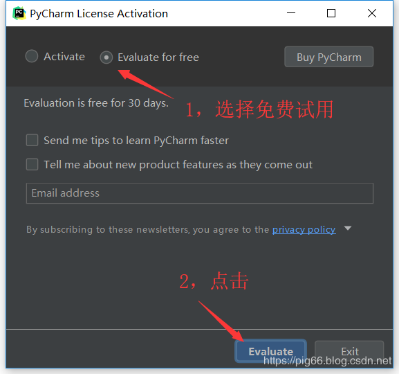 如果你之前已经使用有效期激活过可跳过此步骤,如果你是刚下载的pycharm,则需要点击激活窗口的“Evaluate for free”免费试用,然后再创建一个空项目,这样就可以进入到pycharm的工作页面