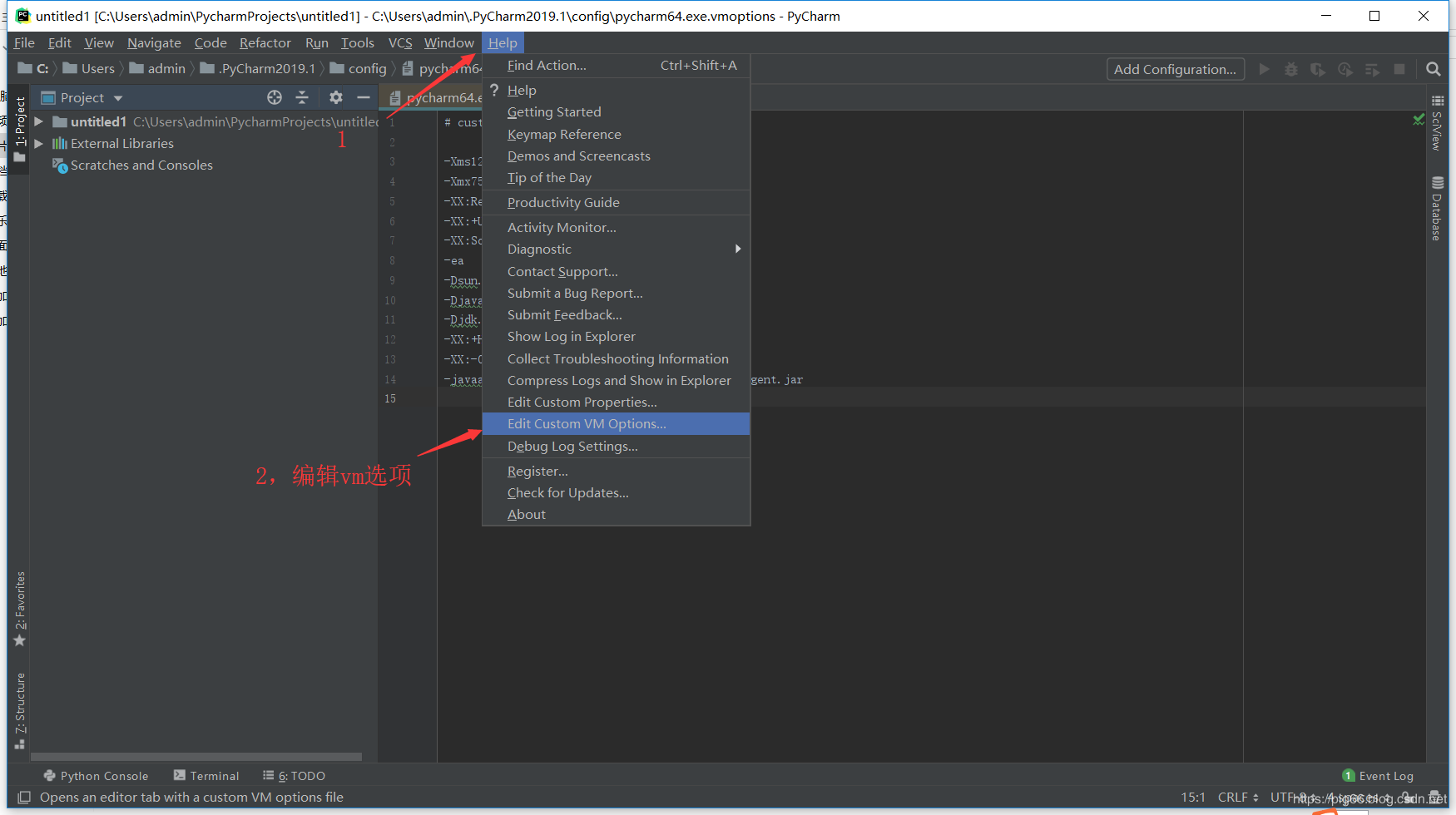 进入到项目界面后,点击Pycharm最上面的菜单栏中的 “Help” -> “Edit Custom VM Options …”,如果提示是否要创建文件,请点”Yes”。