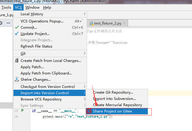 选择pycharm-VCS-import into Version Control -Share Project on Gitee