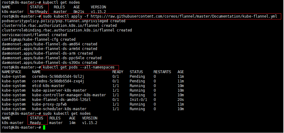 sudo kubectl apply -f https://raw.githubusercontent.com/coreos/flannel/master/Documentation/kube-flannel.yml