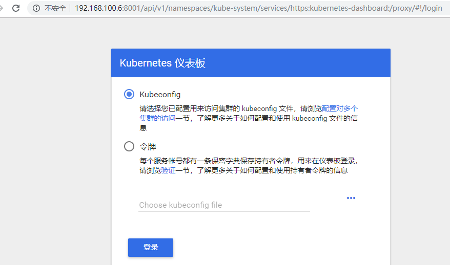 将/root/dashboard.conf 文件发送到宿主机,浏览器访问时选择Kubeconfig认证,载入该配置文件,点击登陆,即可实现访问,如图: