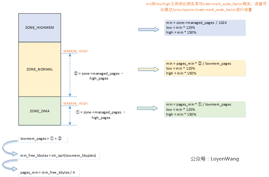 setup_per_zone_wmarks:根据min_free_kbytes来计算水印值,来一张图会比较清晰易懂: