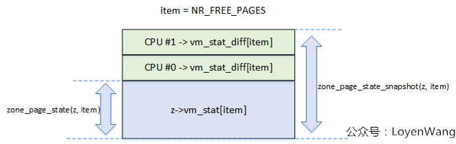 percpu_drift_mask在refresh_zone_stat_thresholds函数中设置的,这个在上文中已经讨论过了。 每个zone维护了三个字段用于页面的统计,如下: