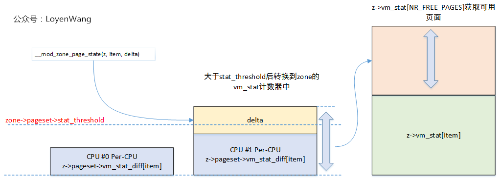 __percpu *pageset计数器的值更新时,当计数器值超过stat_threshold值,会更新到vm_stat[]中,如下图: