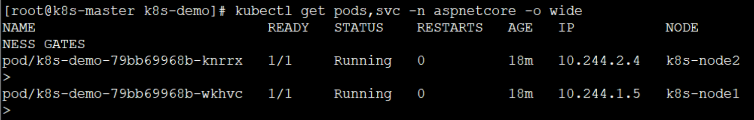 刚刚我们成功部署了一个ASP.NET Core WebAPI项目到K8S集群中,由于在yaml中我们设置了两个Pod副本,他们分别运行在了k8s-node1和k8s-node2中: