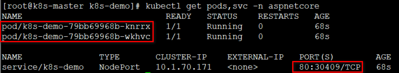 可以看到,在命名空间aspnetcore下,就有了一个k8s-demo的服务运行起来了,并通过端口号30409向外部提供访问。