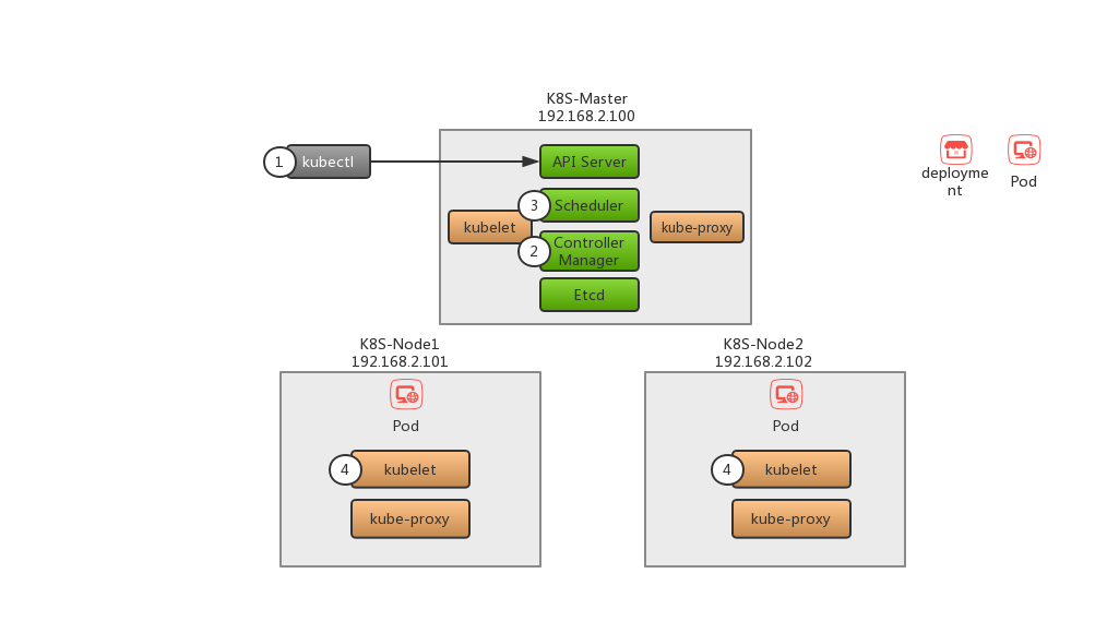(3)Scheduler执行调度任务,将两个Pod副本分发到k8s-node1与k8s-node2