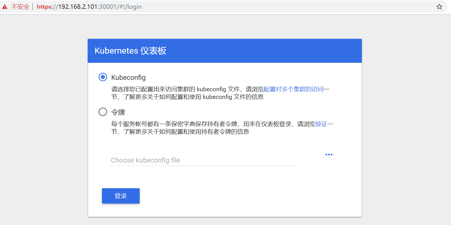 看到提示“service/kubernetes-dashboard created”代表Dashboard创建成功了,这时我们通过浏览器来访问一下: