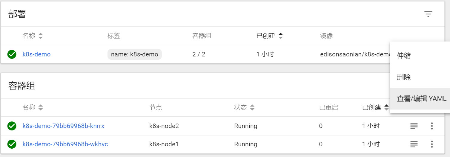 在Dashboard中,我们通过kubectl所做的操作大部分都可以可视化操作,比如我们可以对deployment做伸缩:
