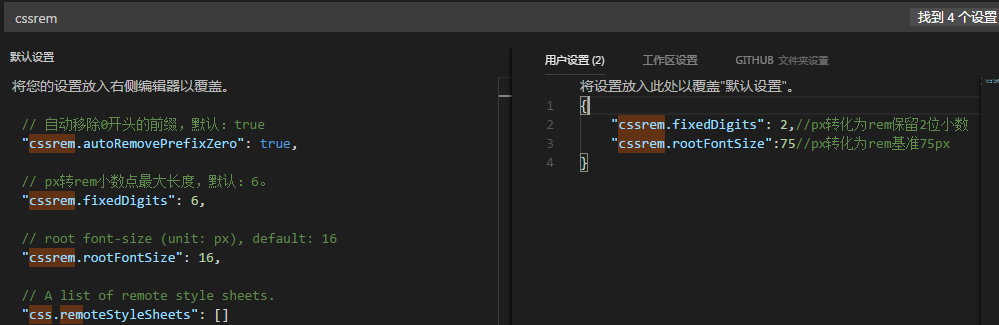 文件-->首选项--设置-->“搜索cssrem”,将自己的设置放入右边覆盖“默认设置”,重启编辑器,即可,如图: