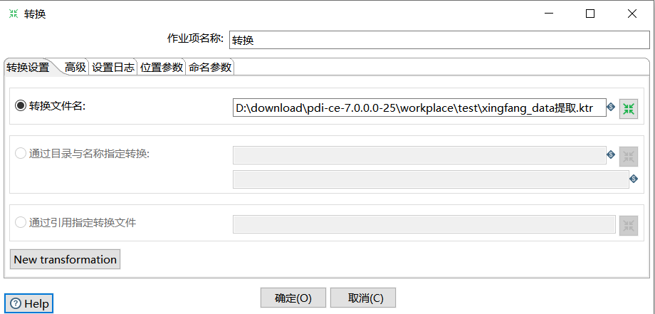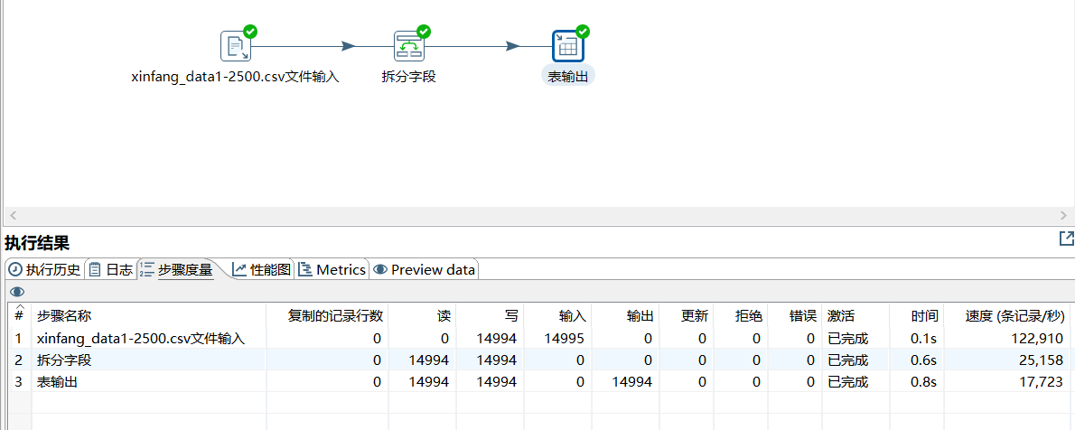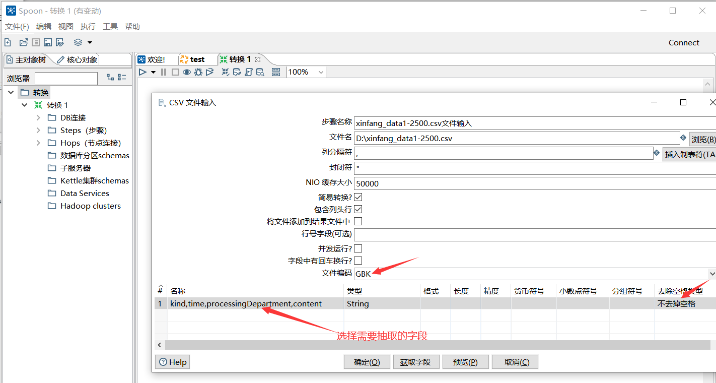 (3)在转换1中新建一个转换;完成输入csv文件,字段切分,输出到表的操作