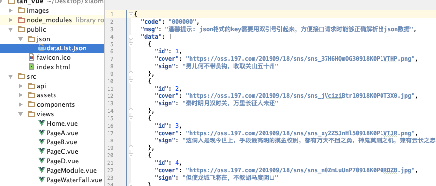 本地准备一个json文件数据,放在项目public文件夹下。注意,本地测试数据必须放在public文件夹下,网络请求时才能请求到数据,这是vue3.x。新增加一个axios依赖包,用来进行网络请求。部分截图,及关键代码: