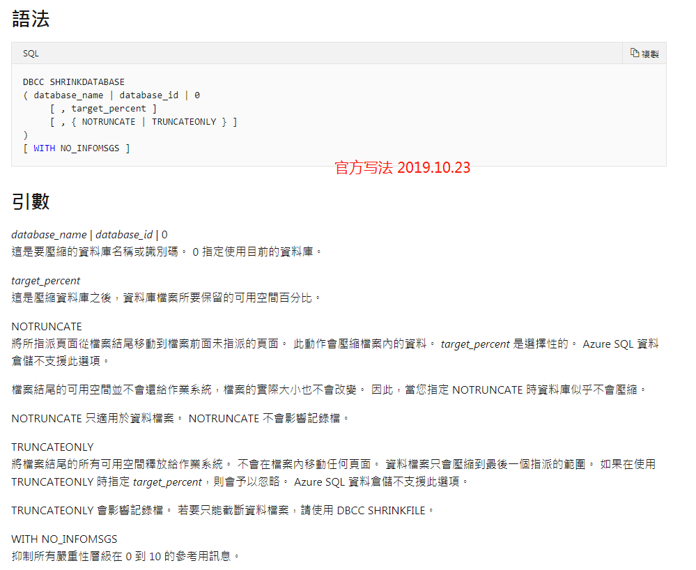 DBCC SHRINKDATABASE(数据库名|数据库ID|0,目标百分比,NOTRUNCATE|TRUNCATEONLY)