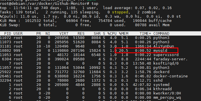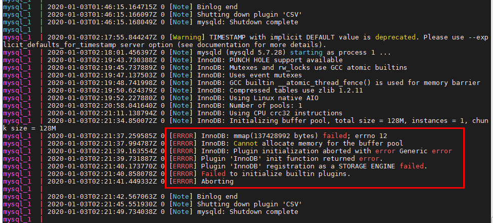 最近用docker部署了个系统,服务器配置是1G的内存,跑了两个容器,一个wbe服务,一个是mysql,使用的过程中发现服务经常挂,一开始因为运行的服务不太重要并且没时间处理就没太在意,每次挂了我就上去restart重启一下镜像。后面找了个时间排查了问题,查看了下docker-compose的日志,发现是因为运行的mysql容器占用内存过高导致的,在此记录下解决过程。