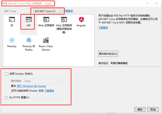 选择.net core 2.1 选择API。docker支持与HTTPS先不用勾,以后有需要可以另加。