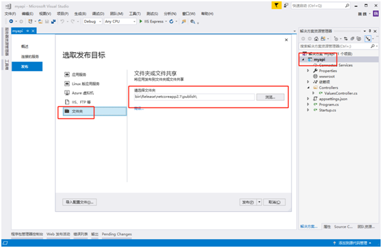 在工程myapi上面右键->发布。选择“文件夹”的方式,默认发布路径即可。直接点击“发布”按钮,发布成功。